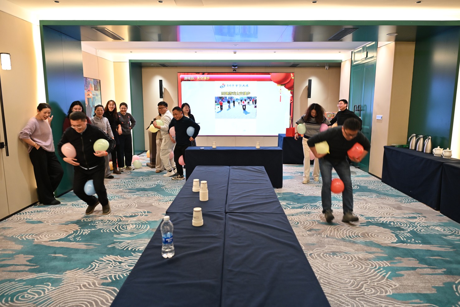 迎新会现场可谓是热闹非凡、气氛火爆,我们精心准备了5个超有趣的互动游戏,每一个都设计得别出心裁,吸引了所有人的目光。活动刚一开始,大家就迅速分成了不同的小组,兴致勃勃地投入到游戏环节中。裁判一边认真观察每一组的表现,一边忙着记录得分,现场欢呼声、笑声此起彼伏,不绝于耳,整个场地充满了活力与快乐的氛围。